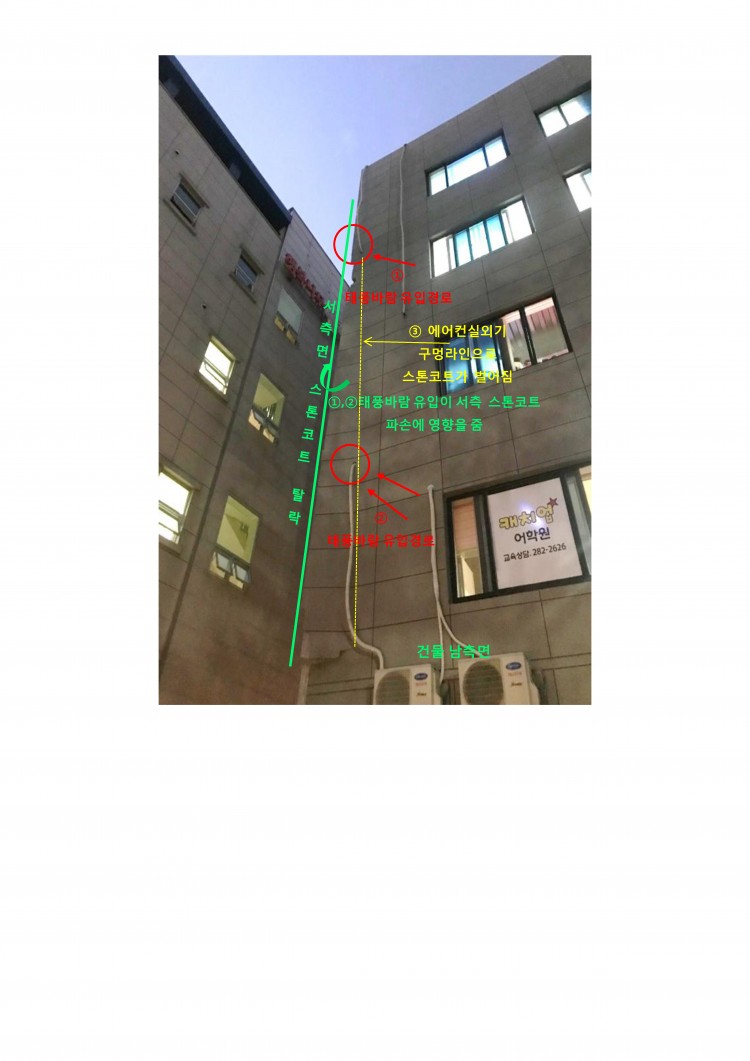 태풍으로 피해가 발생한 당시 스톤코트가 완전탈락한곳은 건물 서측면이고 사진을 찍은곳은 건물남측면입니다.