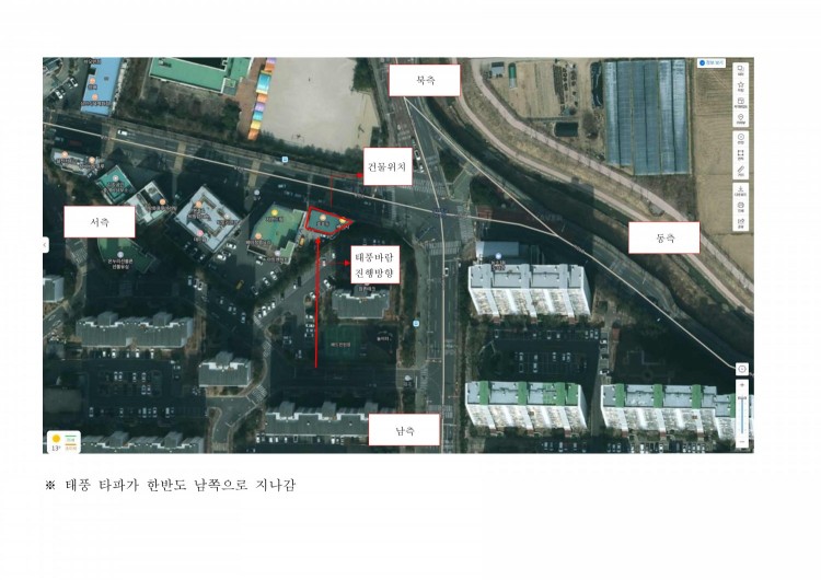 당시 태풍은 건물의 남측에서 북동쪽으로 이동하였고 건물남측면에 바람이 불었고 건물서측면에는 바람의 영향이 없었습니다.