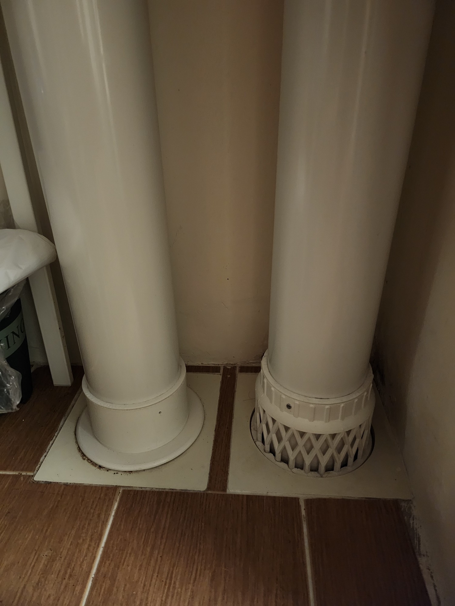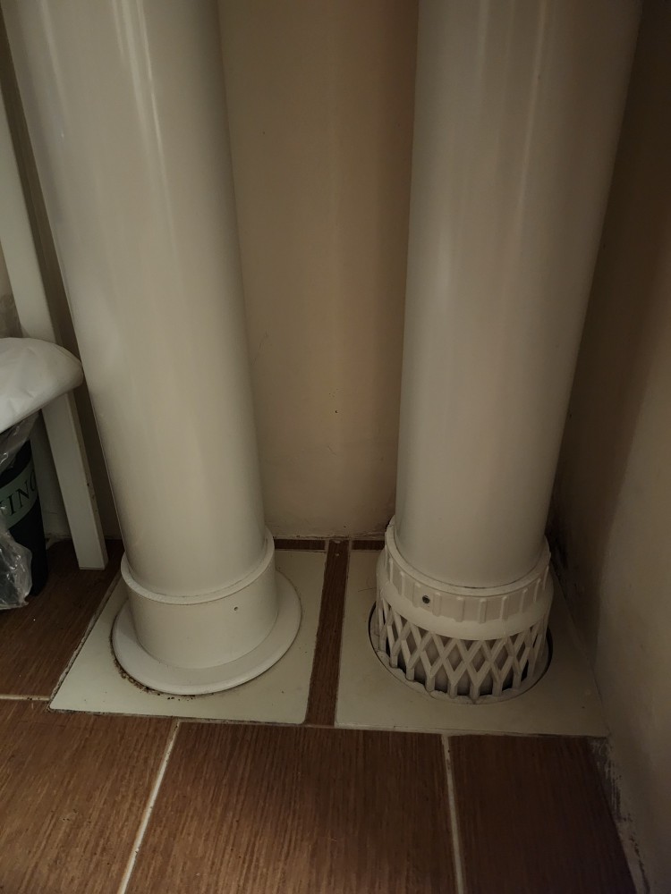 안방베란다의 우수관이 생활하수관과 분리되어 나란히 있고. 우수관의 아랫부분은 막혀있습니다. 비오는날 빗물은 우수관을 통해서 내려가는 소리가 납니다. 아랫집에 누수로