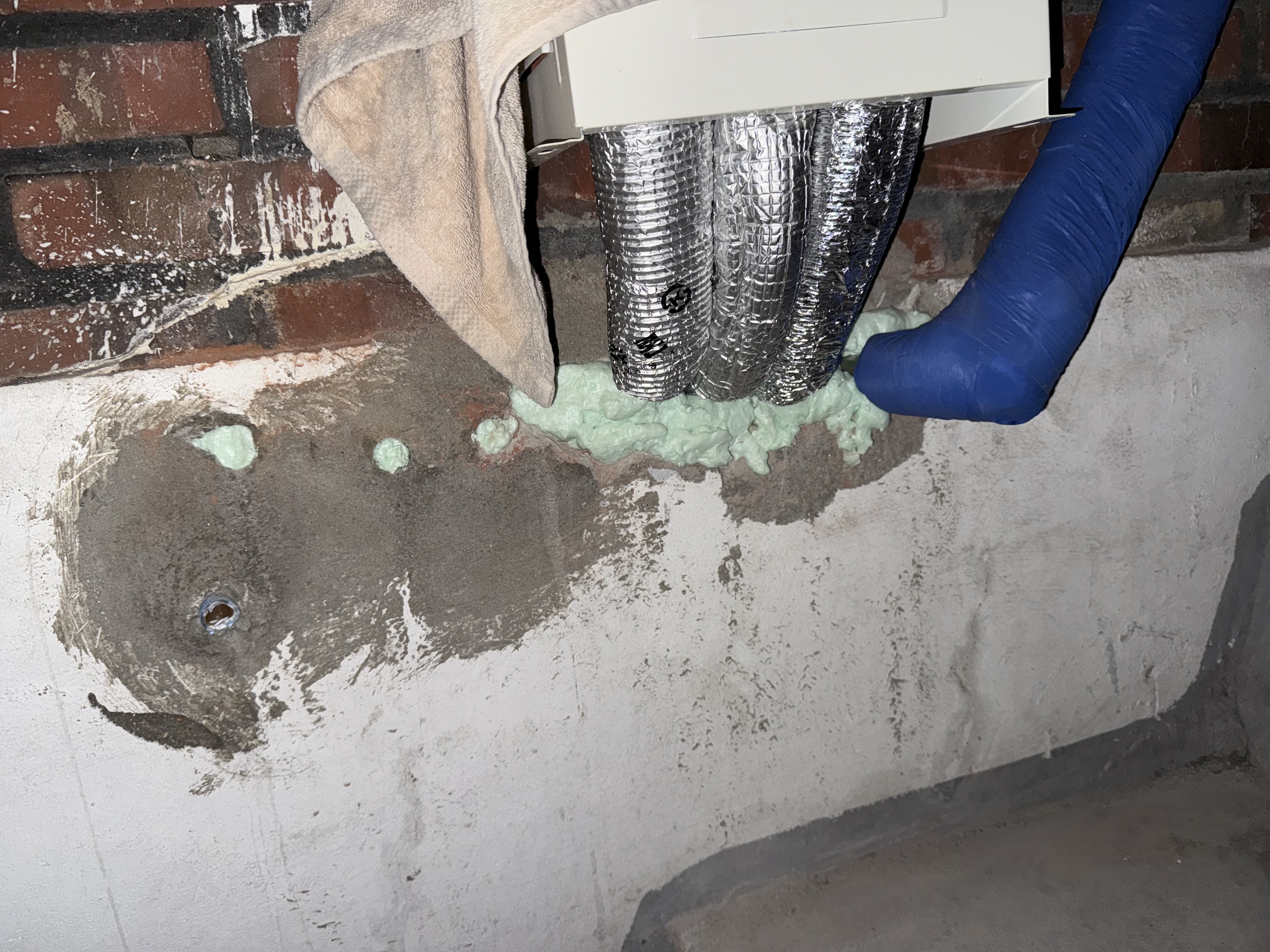 벽면 타공부 및 배관 주변을 우레탄 폼으로 마감한 상태입니다.