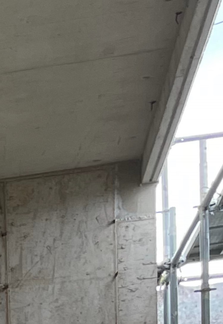 나. 표면이 휘어진 부분 : 이 상태에서 외단열미장마감을 할 수는 없습니다. (물론 할 수는 있지만 접착을 정상적으로 할 수 있는 상태는 아닙니다.) 잘라 내는 것은 테두리보가 잘리기 때문에 할 수 없고, 덧붙이는 것은 그 양이 너무 많아서 할 수 없을 수 있고, 인접대지 경계선 까지의 거리도 따져 보아야 하기에, 설계에 참여한 담당 건축사가 판단을 해야 합니다.