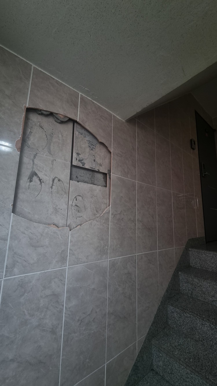 오늘 아침에 큰 소리가 나서 나가보니 복도 타일이 깨졌는데