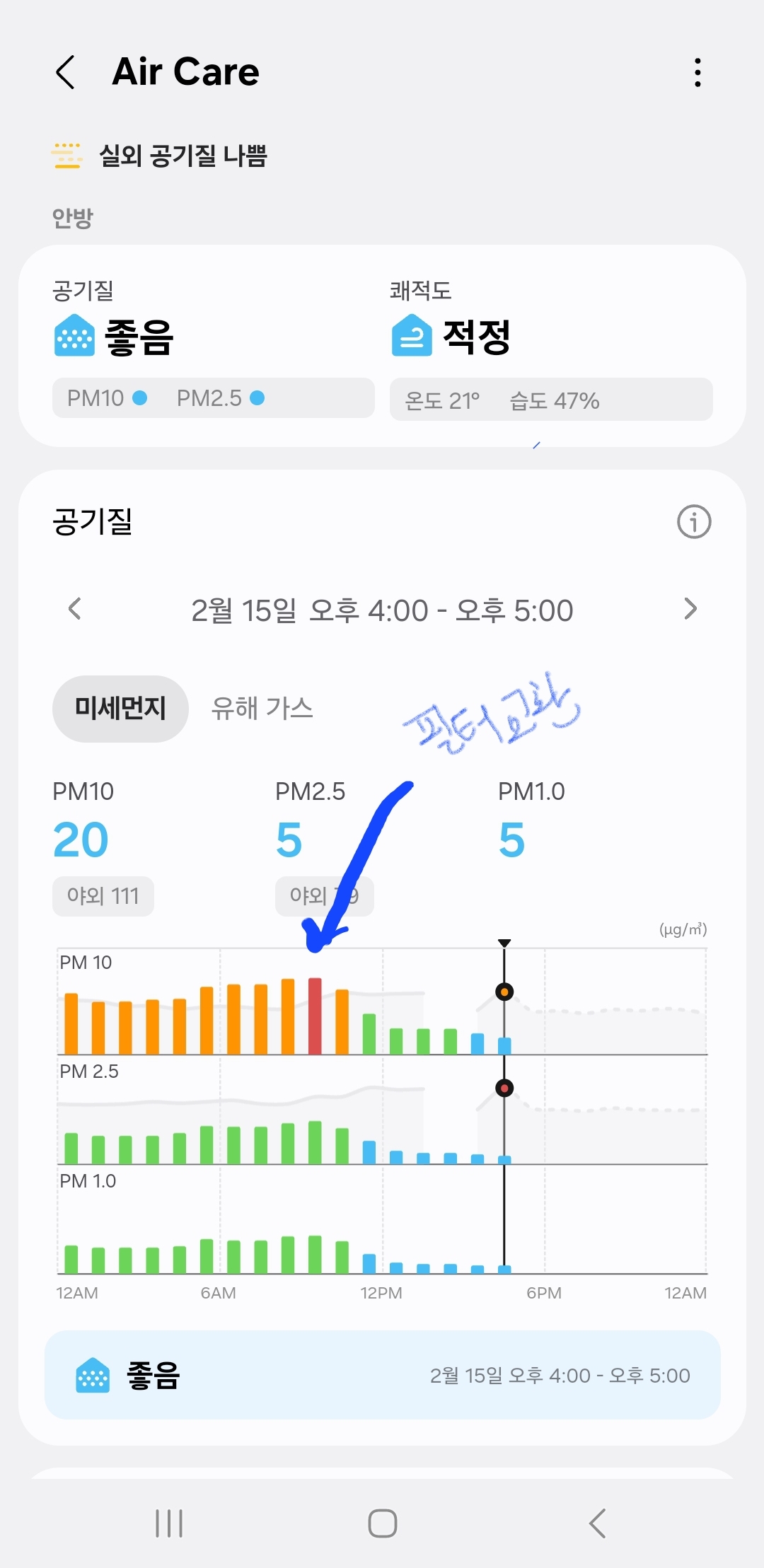환기장치를 설치하면서 미세먼지 없는 실내를 기대했지만 지난 1년간 사용하면서 실내미세먼지수치가 실외와 별반 다르지 않아 의아하게 느꼈습니다
