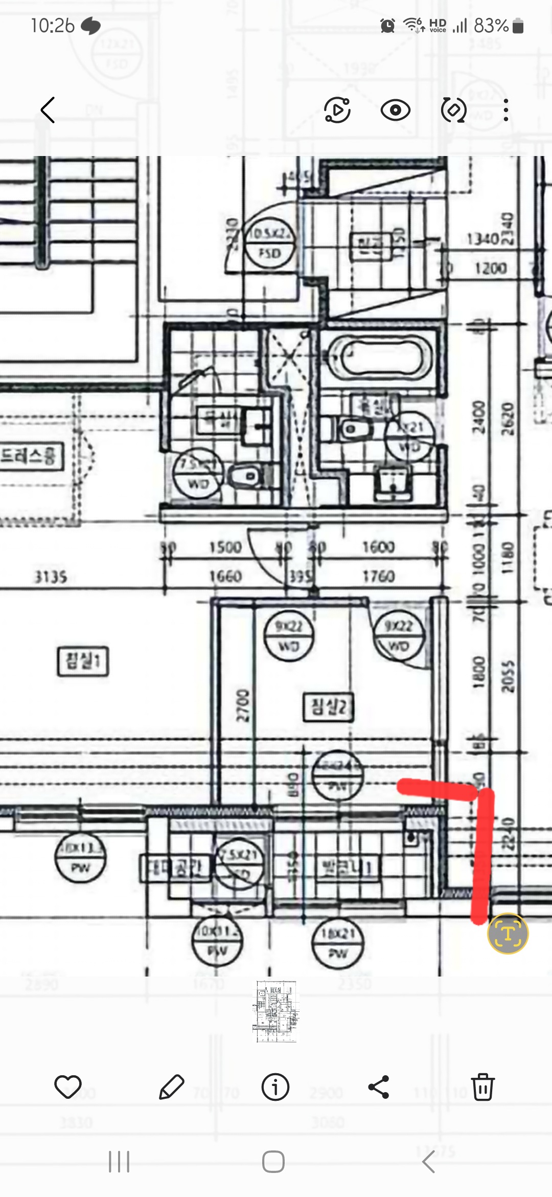두드려보니 퉁퉁소리가 났어요 합판두드리는 소리같이요. 콘크리트두드리는 소리랑 달랐습니다. 평면도는 이걸 받았는데 이걸로 확인이 될까요?? 사진에서 빨간색으로 표시한 부분 발코니입니다.