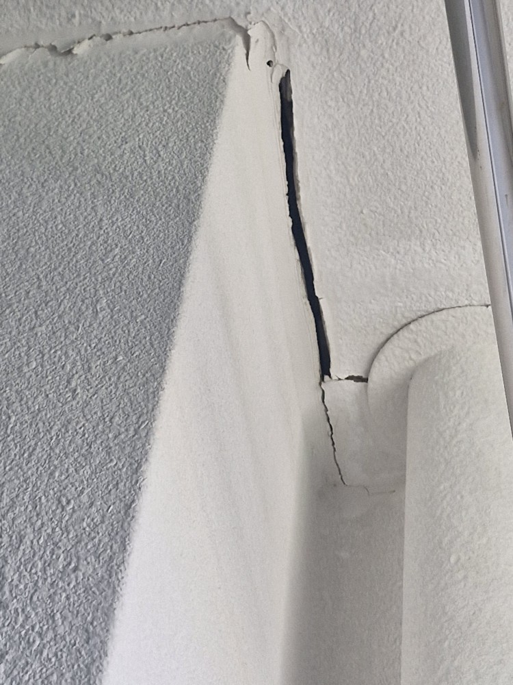 벽체도 콘크리트 벽체가 아니라 조적벽체에 일 것같은데요. 외벽이랑 팽창정도가 달라서 나오는 크랙 같습니다. 외관이 마음에 안 드신다면, 상단부는 탄성 있는 재료를 사용해서 가볍게 막는 정도면 될 것 같습니다.