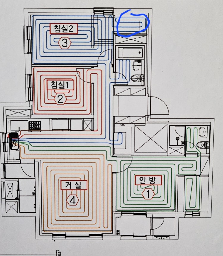 사진에 표시된 부분(드레스룸)이 난방이 안되는데요. 사진상과 같이 표시된 부분의 배관은 분배기로부터 나와 드레스룸->침실2로 연결되어 있습니다. 동일배관 라인은 다 난방이되는데 저부분만 안되는게 너무 의아합니다. 평면도상과는 다르게 저 부분만 배관이 누락이 된건지...이론적으로 같은 배관인데 저 부분만 난방이 되지 않을 수 있는건지 궁금합니다.