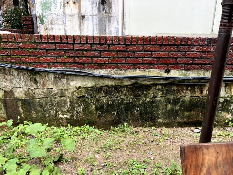 다만, 이 콘크리트벽이 지하층의 외벽이라면 구조적으로 그다지 좋지 않은 상태입니다. 아마도 이 담장 너머에 (불법)증축을 통해 하중이 상당히 증가한 것이 균열의 원인으로 보이긴 하나, 그저 추측일 뿐입니다.