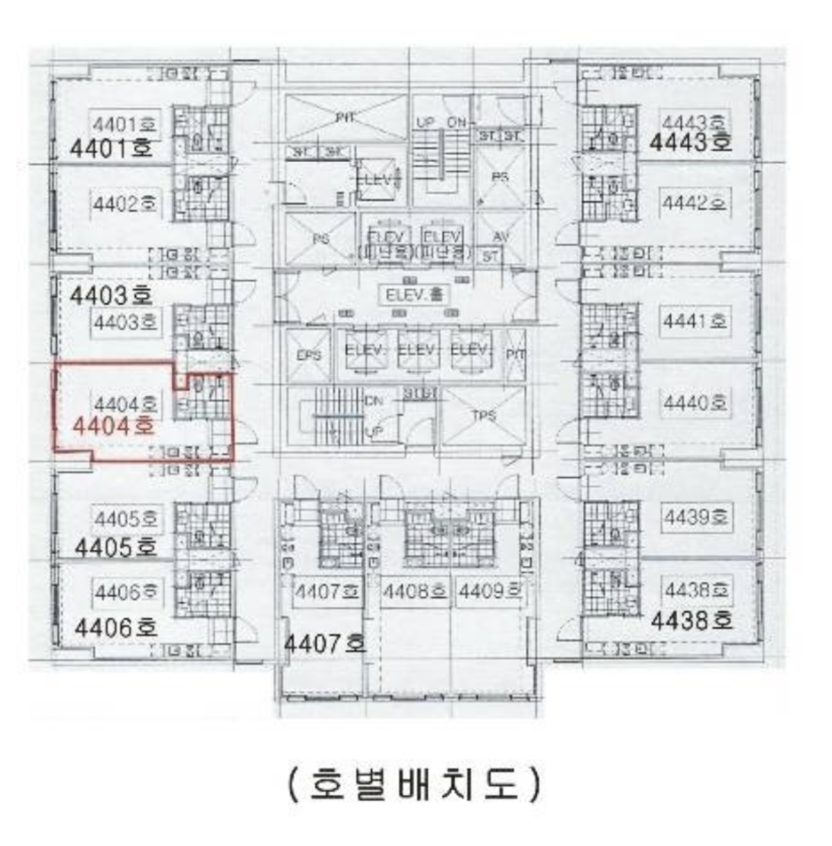도면상의 4405호 위치라 엘리베이터 앞집이거나, 기계실 앞집은 아닙니다.