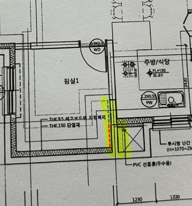 도면을 보면... 파란색 선에는 얇은 단열재(결로방지단열재)가 들어 있는 것 같은데, 붉은 색 선을 따라서는 단열재가 없는 것으로 보입니다. 신축이라면 시공사와 다툼의 여지가 있는 부분인데.. 구축이라면 그게 어려운데요. 단열 결손에 의한 결로로 보이므로, 젖은 벽지를 떼어내서 단열재 여부를 보셔야 할 것 같습니다.