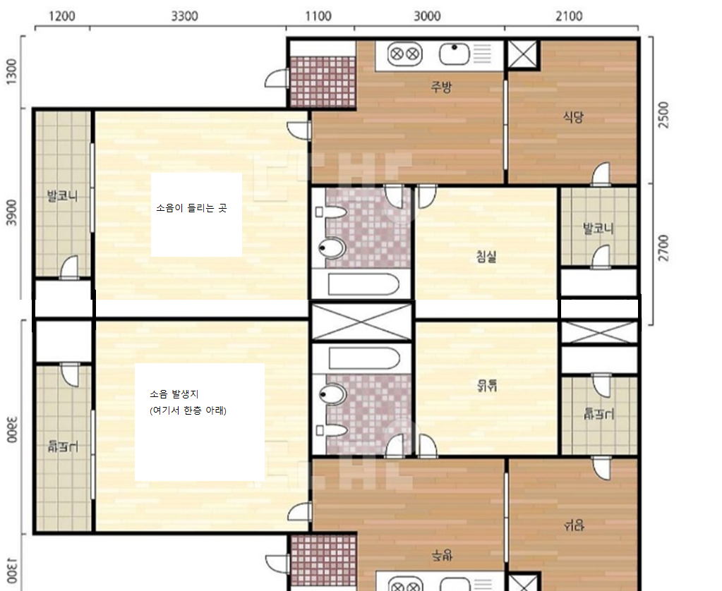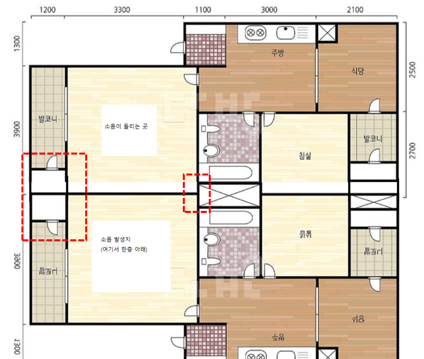 단면을 그렸습니다. 다른 집에 사는 사람의 TV소리가 넘어오는 것입니다.