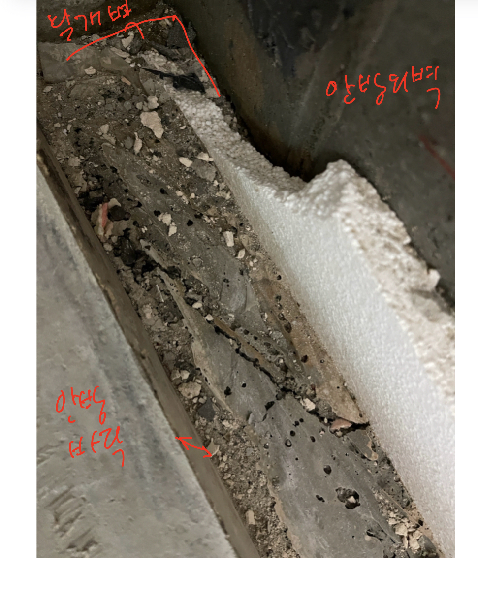 2. 공사를 할 때, 이 부분 처리가 어떻게 될지 모르겠습니다.  안방 단열재 드러낸 바닥입니다. 시멘트 안방 바닥과 약간 단차를 두고 기포 콘크리트(?)가 있는 것 같은데 저 크랙을 메꿔야 하겠지요? 메꾼다면 어떤 방법이 있을지 궁금합니다. 고뫄스같은 방수를 하면 어떨까요? 저 스티로폼은 같이 타설이 되어 있어서 제거를 다 하고 단열재를 붙여야 하는지 궁금합니다.