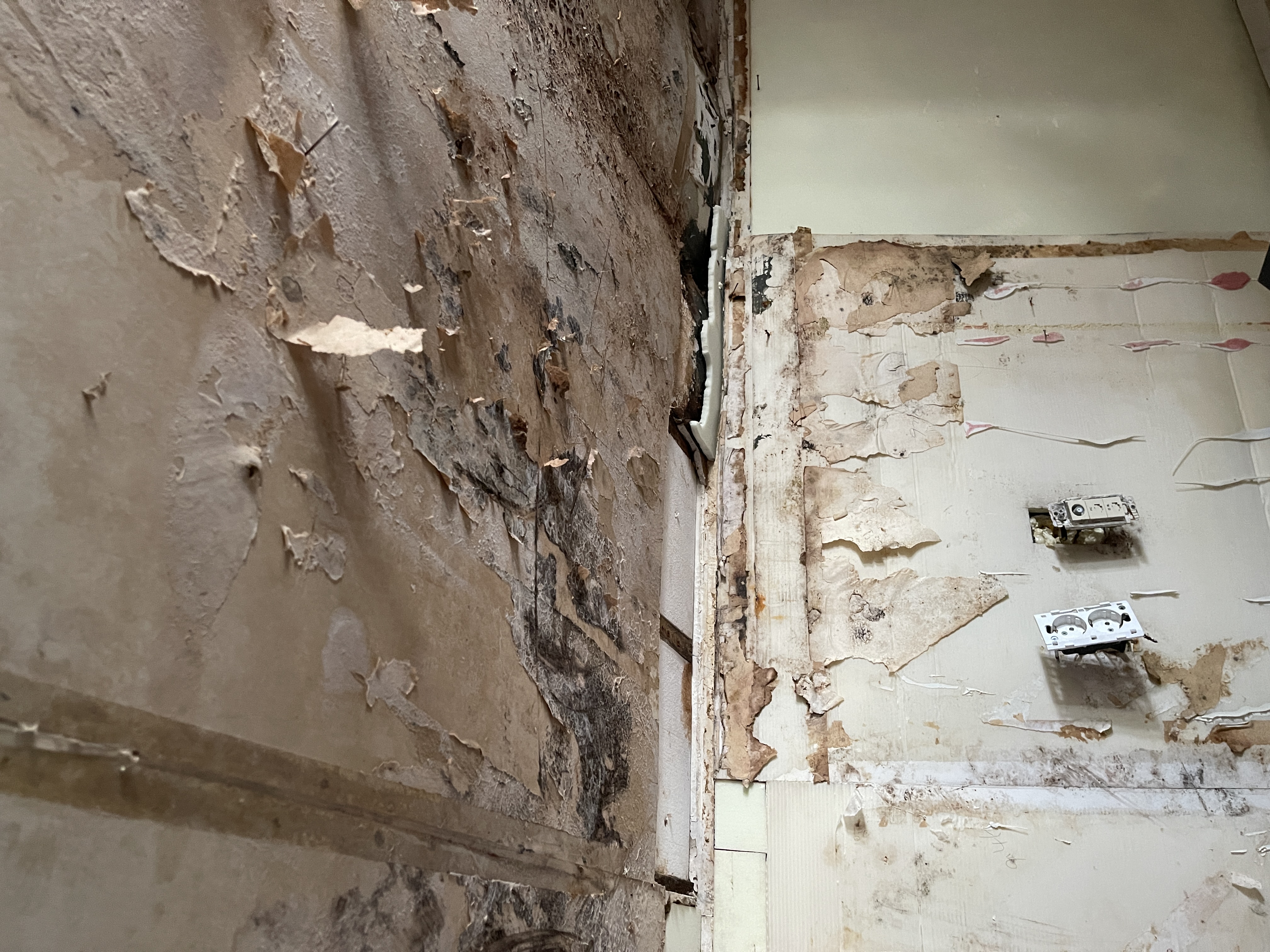 3. 옥탑방입니다. 다 뜯어보니 상태가 이렇습니다. 관리사무소에서 도면을 받아보니, CRC보드에  단열재(뜯어보니 스티로폼입니다)가 시공되어 있던 것 같습니다. 외벽과 맞닿은 벽면만 우선 뜯었습니다. 시멘트 보드는 제가 떼지 않아도 이미 건드리면 삭아서 떨어지는 상태입니다. 그 밑에 스티로폼 같은 단열재가 들어있는데 안쪽은 단단한데 바깥쪽은 배가 불러있어(단단합니다) 어떻게 해야할지 모르겠습니다. 이것까지 제가 뜯어야 하는 걸까요? 제대로 시공을 한다면 그래야할 것 같은데 너무 큰 공사가 될 것 같네요.