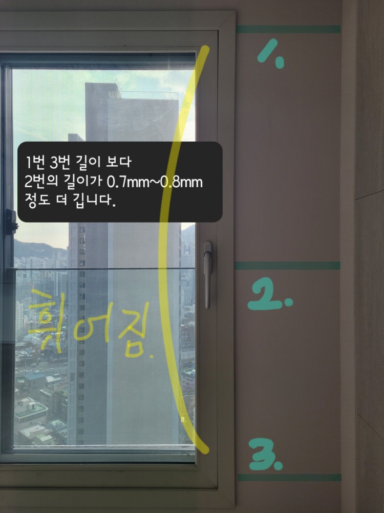 창틀의 측부가 휨현상이 발생하였다면 창틀과 마감재와 차이를 확인하는 것이 아니라