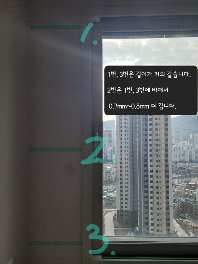 창틀 내부 내경의 상하 중간 길이의 차이를 확인하는 것이 정확한 것입니다.