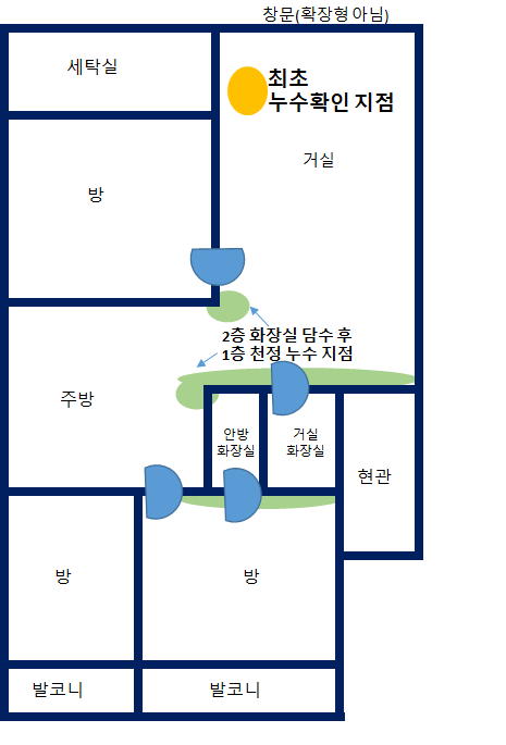 1차 아버지께서 누수업체부름. 그 날 천장이 말라있어 세는게 없어 철수. 그날 밤 태풍이 와 비가 오고 아래집에서 누수가 된다하여 다음날 동일 업체에서 압 체크등 확인 후 2층(윗집)은 이상이없고 비가올때 물이세는거 같으니 외벽 등 우수관등 외부요인같다 철수.