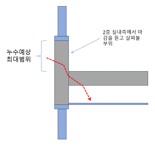 천장 속의 슬라브에서 떨어지는 물이므로, 2층 창문의 하단 부분에서의 문제로 보는 것이 맞아 보입니다.