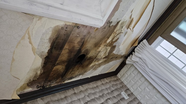 맨 아래 사진 확대하면 우측 열려있는 창문으로 누수 된 천장이 보입니다.