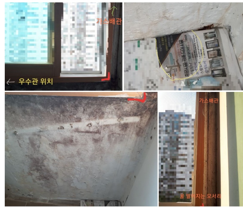 올봄에 아파트 외부 도장공사를 했고, 외벽 보수 공사도 같이 진행한 걸로 알고 있는데 그 이후에도 비가 오면 같은 상황입니다.