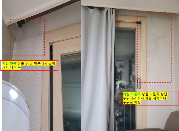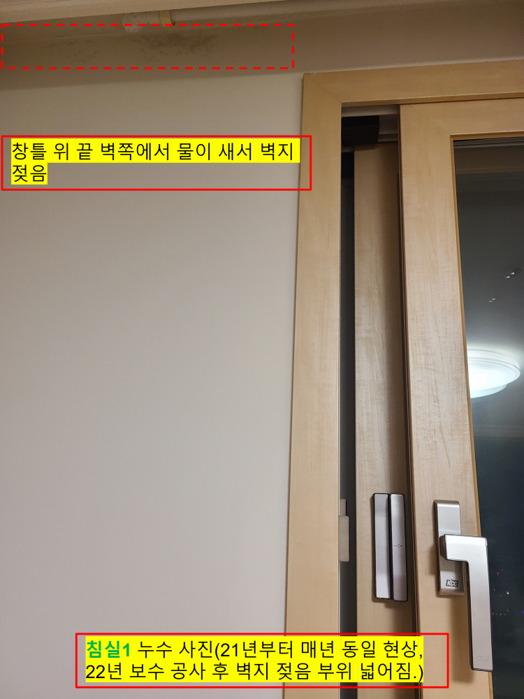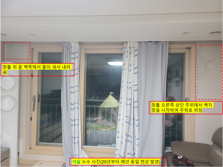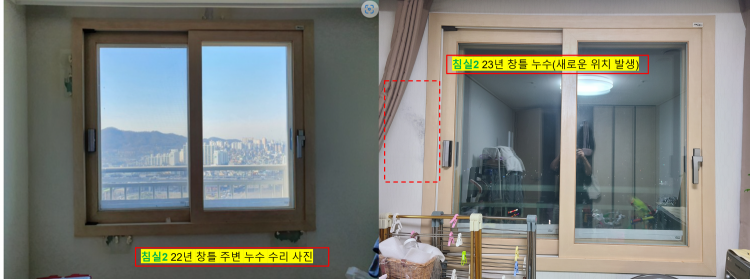 관리자님의 보수 의견을 건설사 쪽에 전달해서 작년에 보수를 받았지만, 동일한 누수 현상이 지속 되고 있습니다.(거실, 침실1, 침실2 창틀 주변 및 창틀 위 벽면 벽지 젖음 및 곰팡이) 그나마 작년까지는(20년, 21년, 22년) 누수 발생 시 건설사에 AS 요청을 하였지만(AS 요청을 해도 누수 지속) 현재 저희 아파트는 건설사와 5년 차 하자 보수 관련 소송이 진행되어 해당 건설사로부터의 보수 AS 처리가 불가능한 상황입니다.