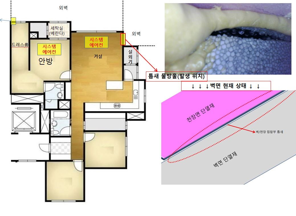 올리신 사진 중에서 단열재 표면에 물이 묻어 있는 부위가 정확하게 어느 부위인지.. 평면에 표시해 주실 수 있으실까요?