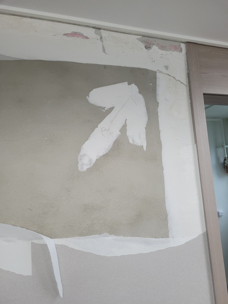 아파트 거실 쪽 벽면 윗부분에 기울기가 심해서 하자처리 중에 있습니다.