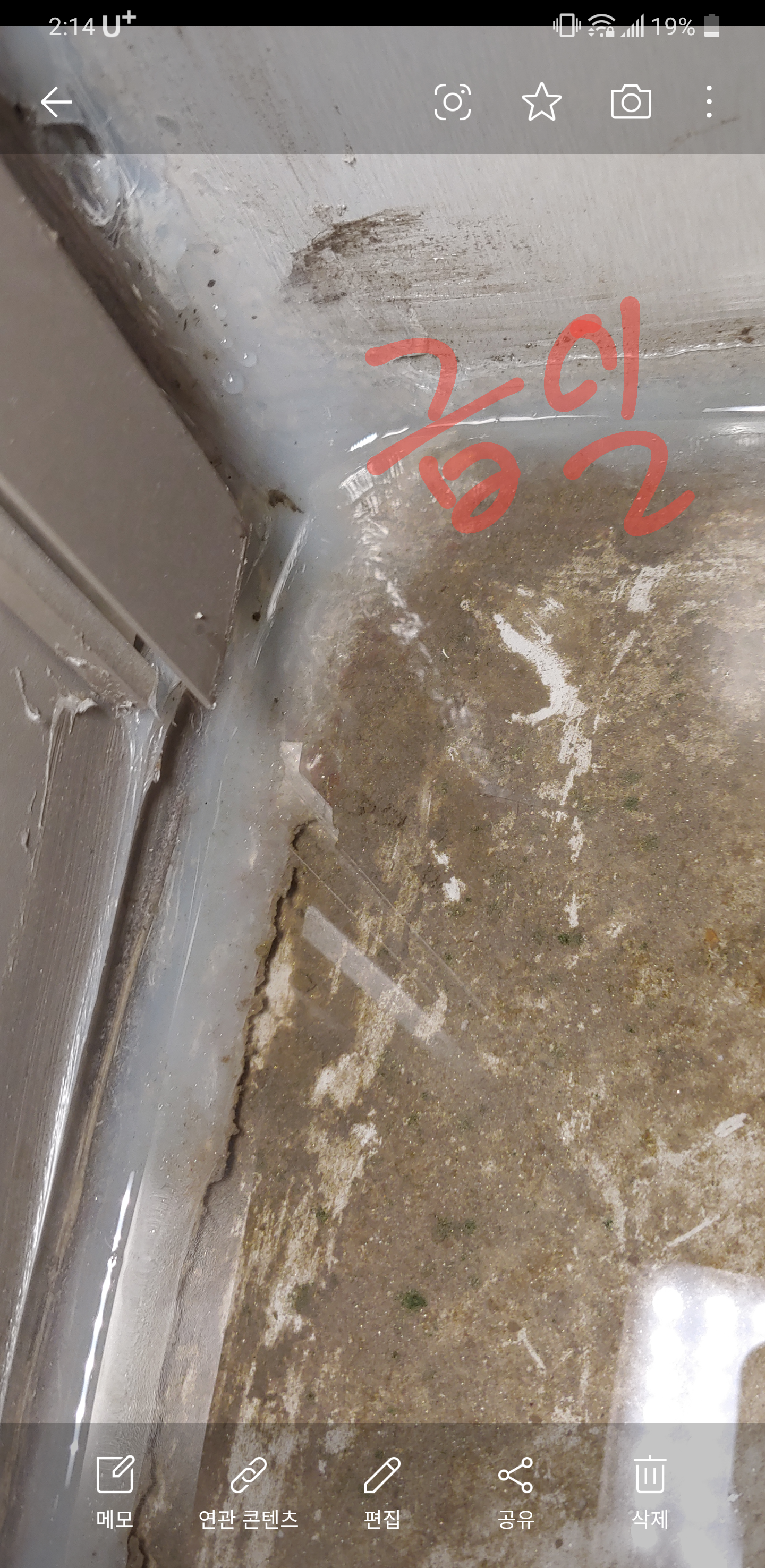 사진처럼 비가 적당히 멈추어서 물을 닦고 솔로 먼지도 털어냈으나 사진처럼 이미 실리콘 밑에 위치한 먼지는 닦이지가 않습니다. 이사이로 물이 새들어갈 수 있을 것 같습니다.