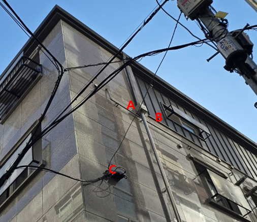 말씀해주신 전선과 건물 접합부입니다. 더 가깝게 찍고 위에서 찍고 싶지만 한계가 있어 이렇게 밖에 못 찍었습니다 ㅠㅠ