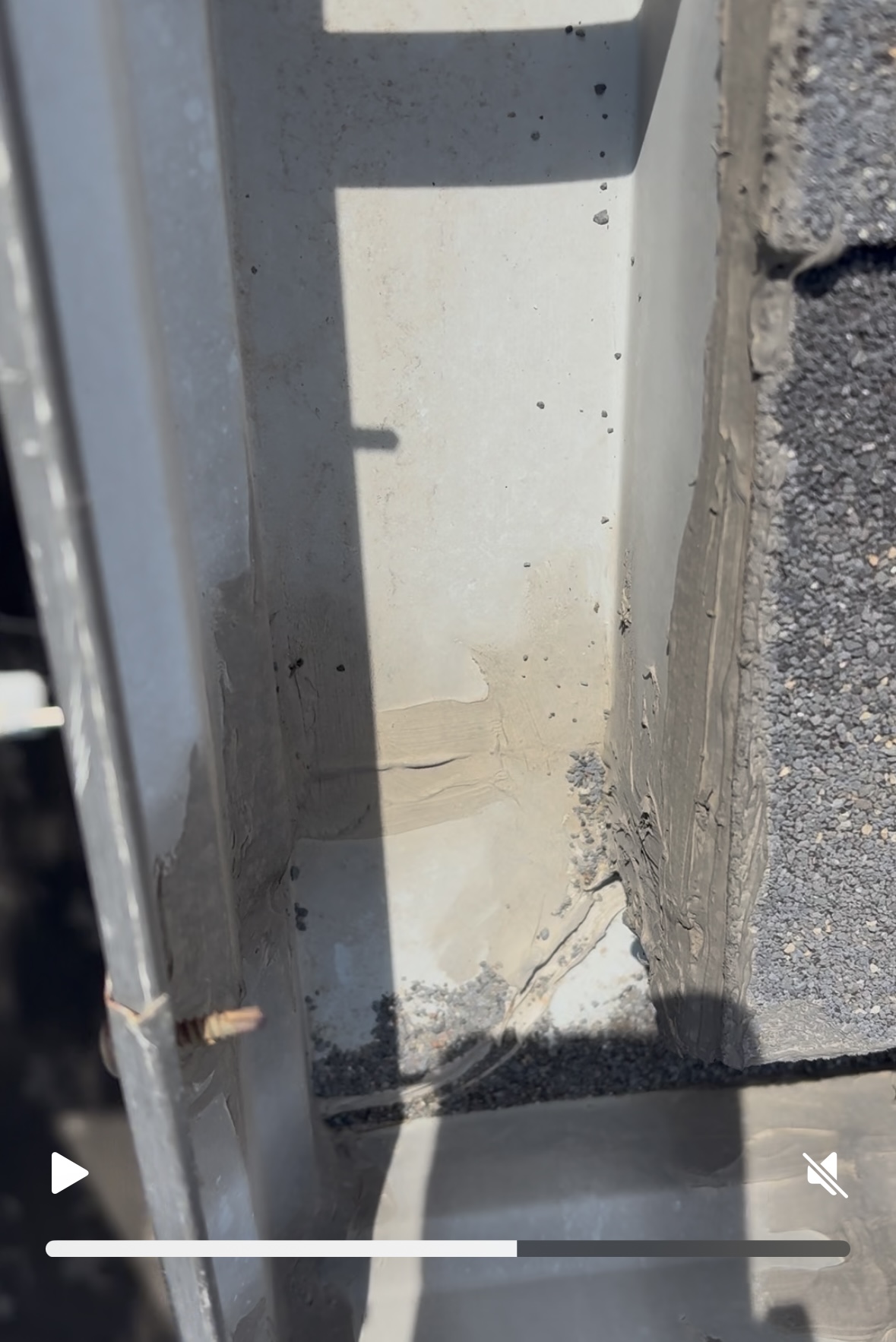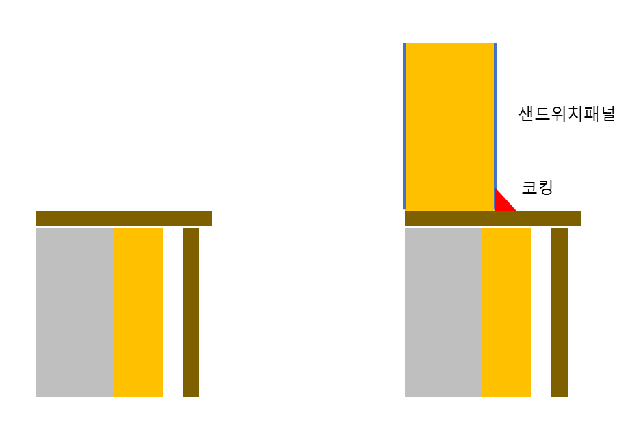 확장을 하면서, 두겁석을 제거하고 기존 구조체 위에 확장 샌드위치 패널을 올리고, 방수처리를 해야 하는데.. 예측컨데 두겁석을 그대로 두고 그 위에 바로 샌드위치패널을 올린 것으로 보입니다.