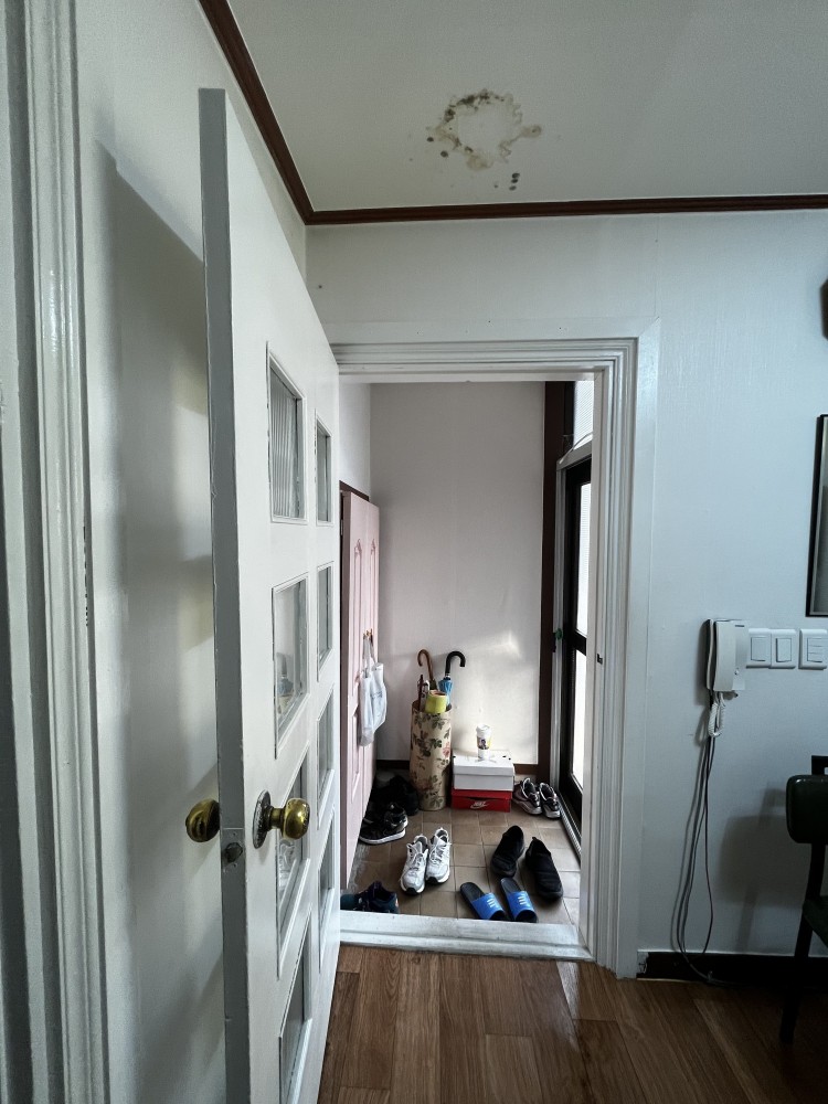 1층 출입구쪽에 살짝 생김, 사진상 왼쪽이 누수가 심한 안방 (기타 거실 및 다른방은 누수없음)