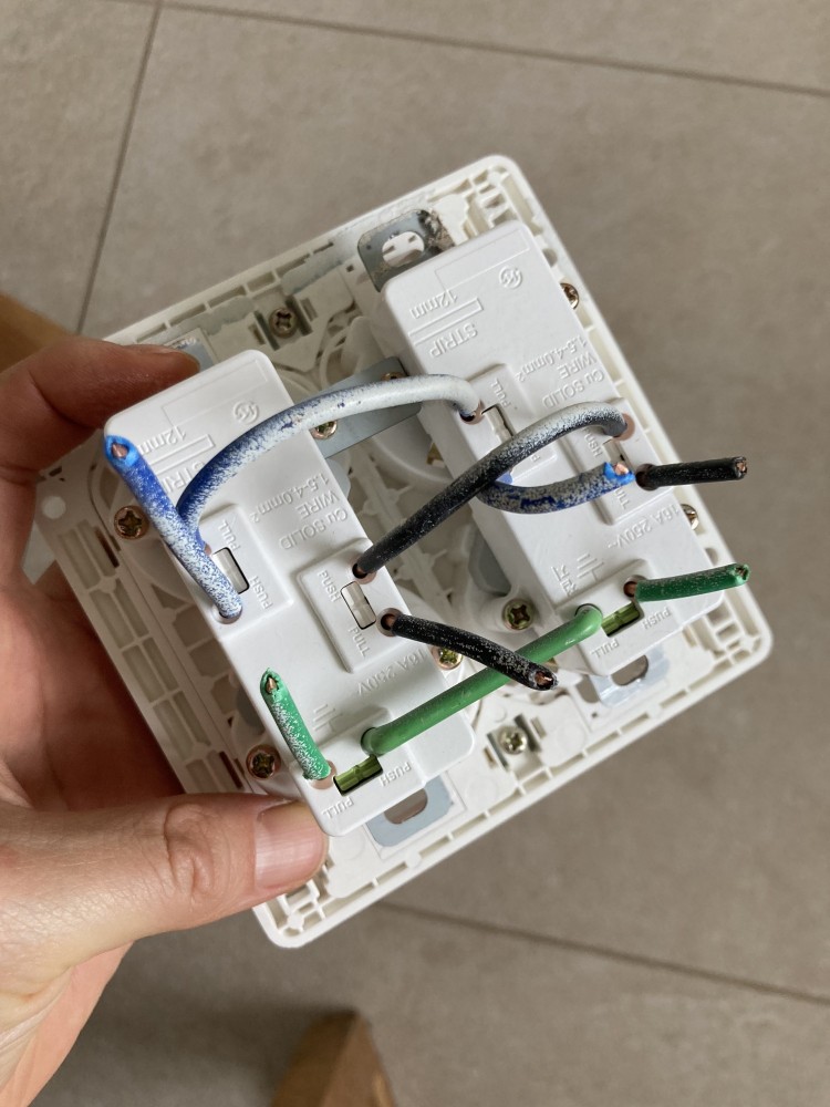 흑과 청 각 두가닥씩 중 한가닥씩은 전선관을 통해 다른 콘센트로 가는 커먼 회로인데, 그것을 너무 강하게 당기면 다른 콘센트 기구의 단자 스냅에 체결되어 있던 단심선이 빠져버리게 됩니다. 전선관의 거리가 짧을수록 가능성도 높구요.