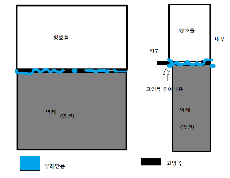 아래 사진은 업체가 전체 창중 일부분을 재시공하고난후  우레탄폼이 양생된후의 외부모습을 확인해본 것입니다