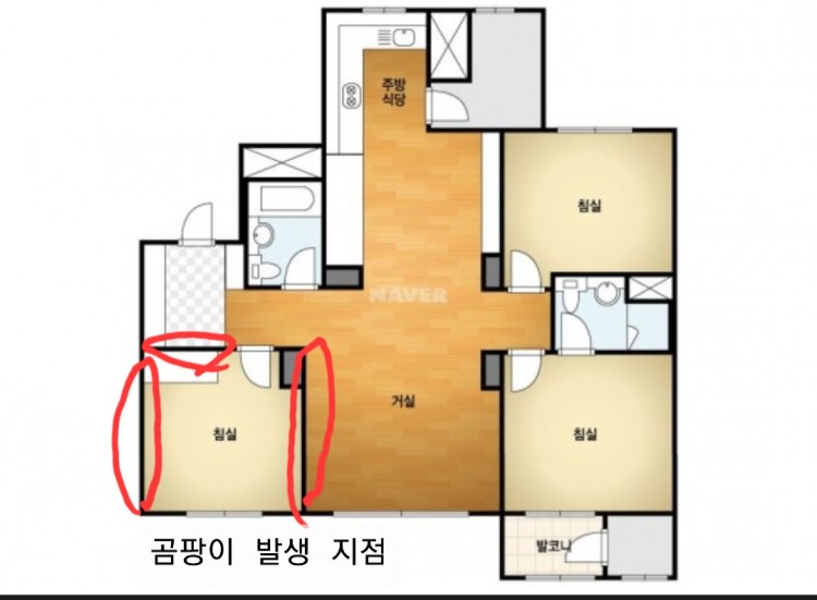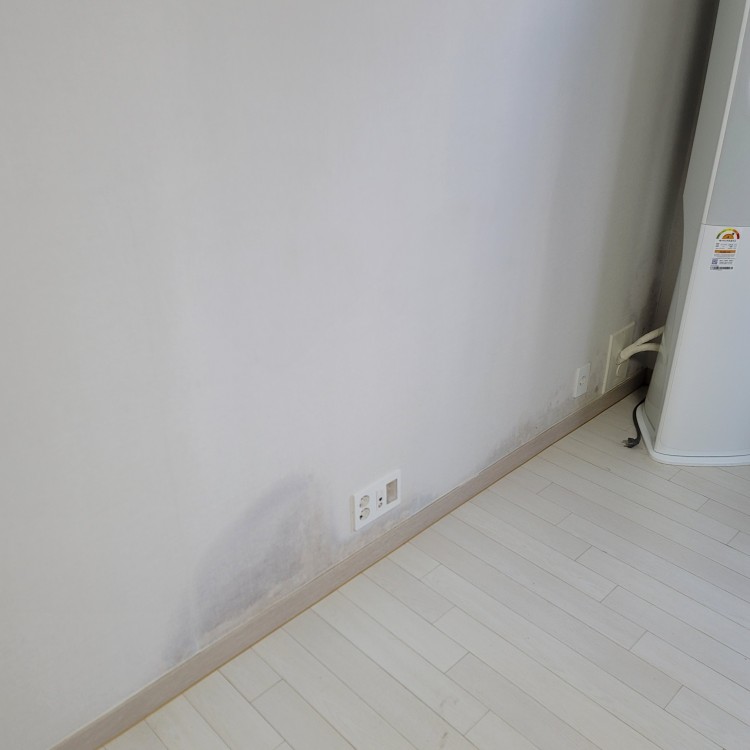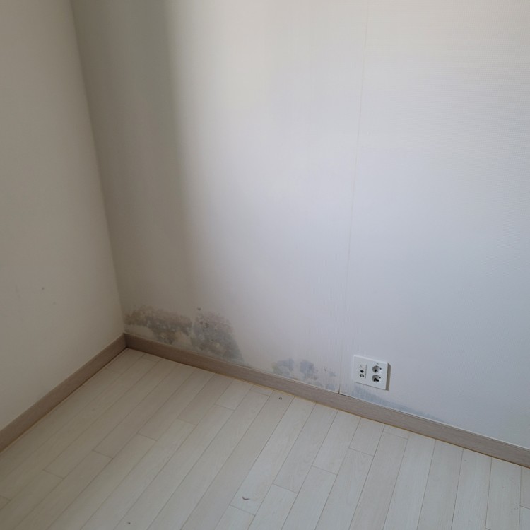 곰팡이가 발생한 위치는 현관문을 통해 들어오고 바로 보이는 작은방과 거실 사이의 벽 하단부에서 발생하였습니다.