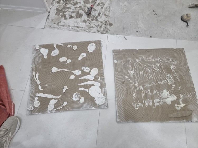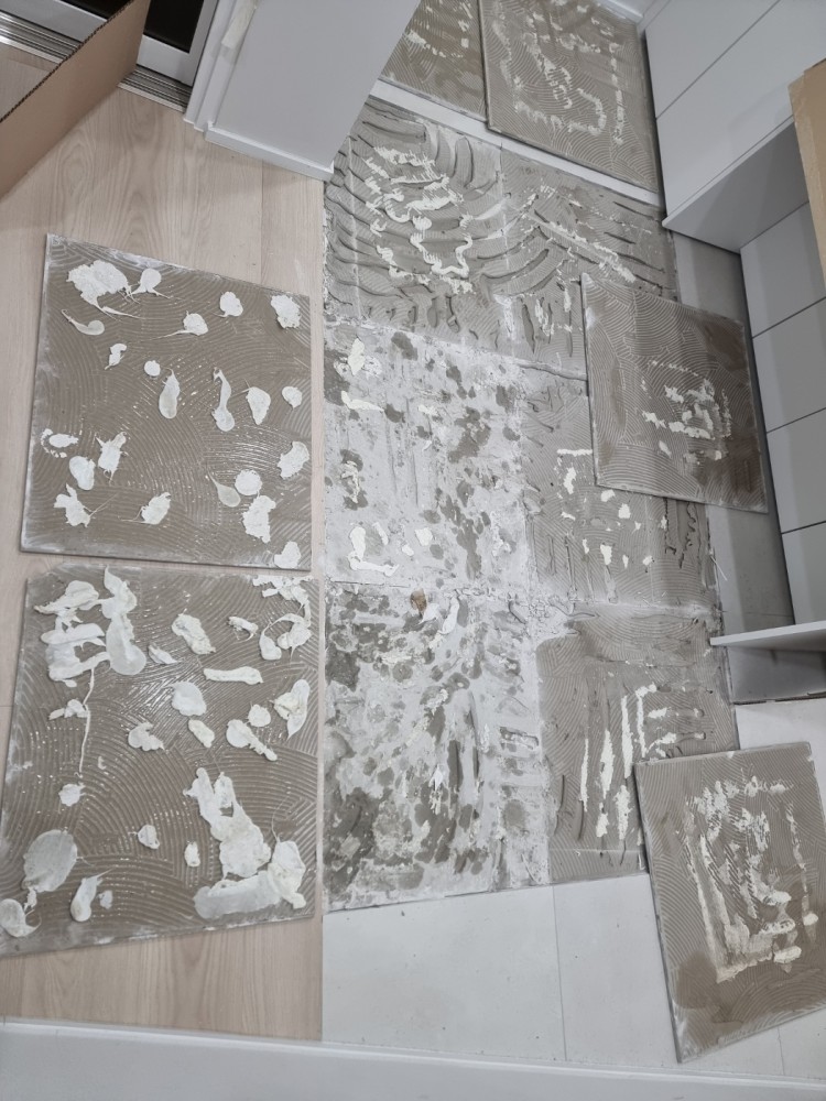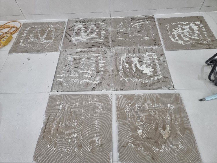 바닥 타일은 전면 접착으로만 가능합니다. 즉 타일 뒷면에 접착보드가 전면에 다 발라져야 하는데.. 다 바른 것으로 보이긴 하나, (높이를 맞추려는 특별한 의도가 있었을 것 같긴 한데) 접착본드가 너무 얇게 발라져서, 필요한 부착강도가 나오지 못하는 상황입니다.
