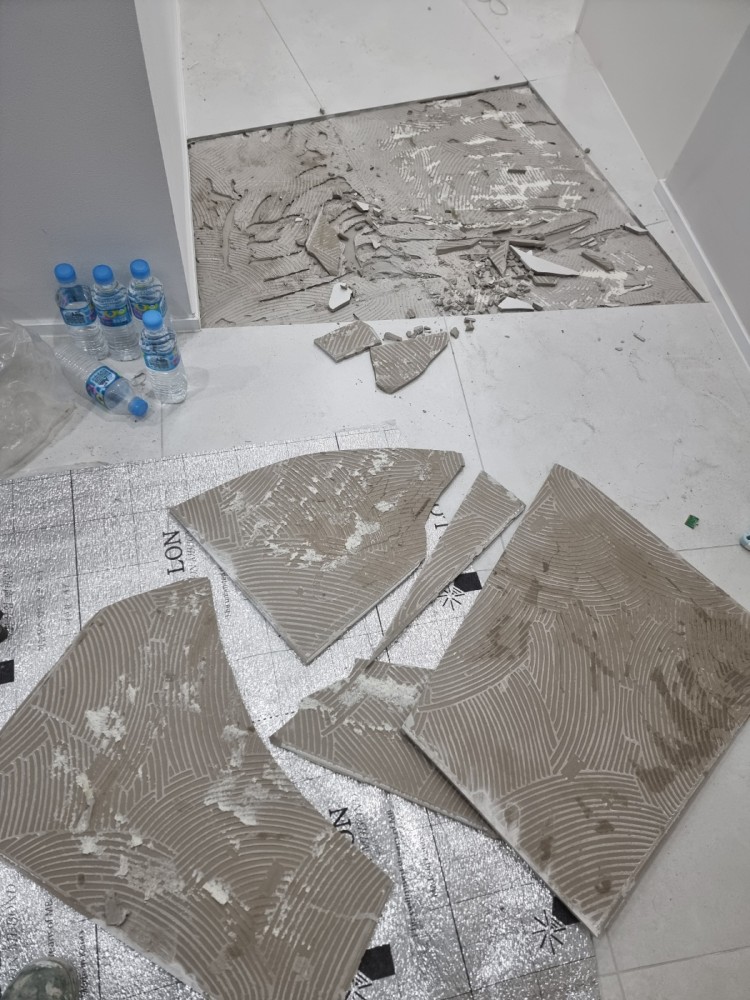 바닥과 타일이 압착이 안되어 타일이 온장으로 떨어져 나왔습니다.(여러군데)