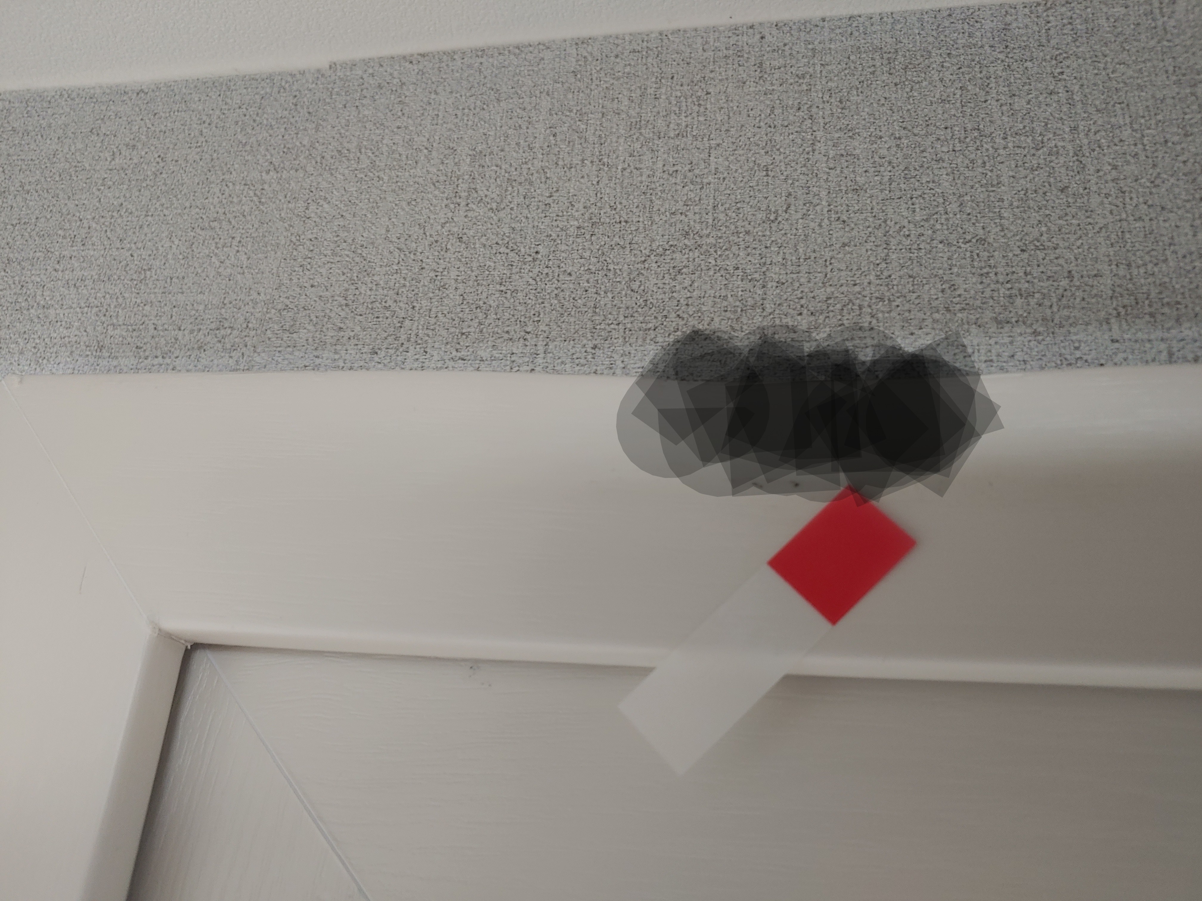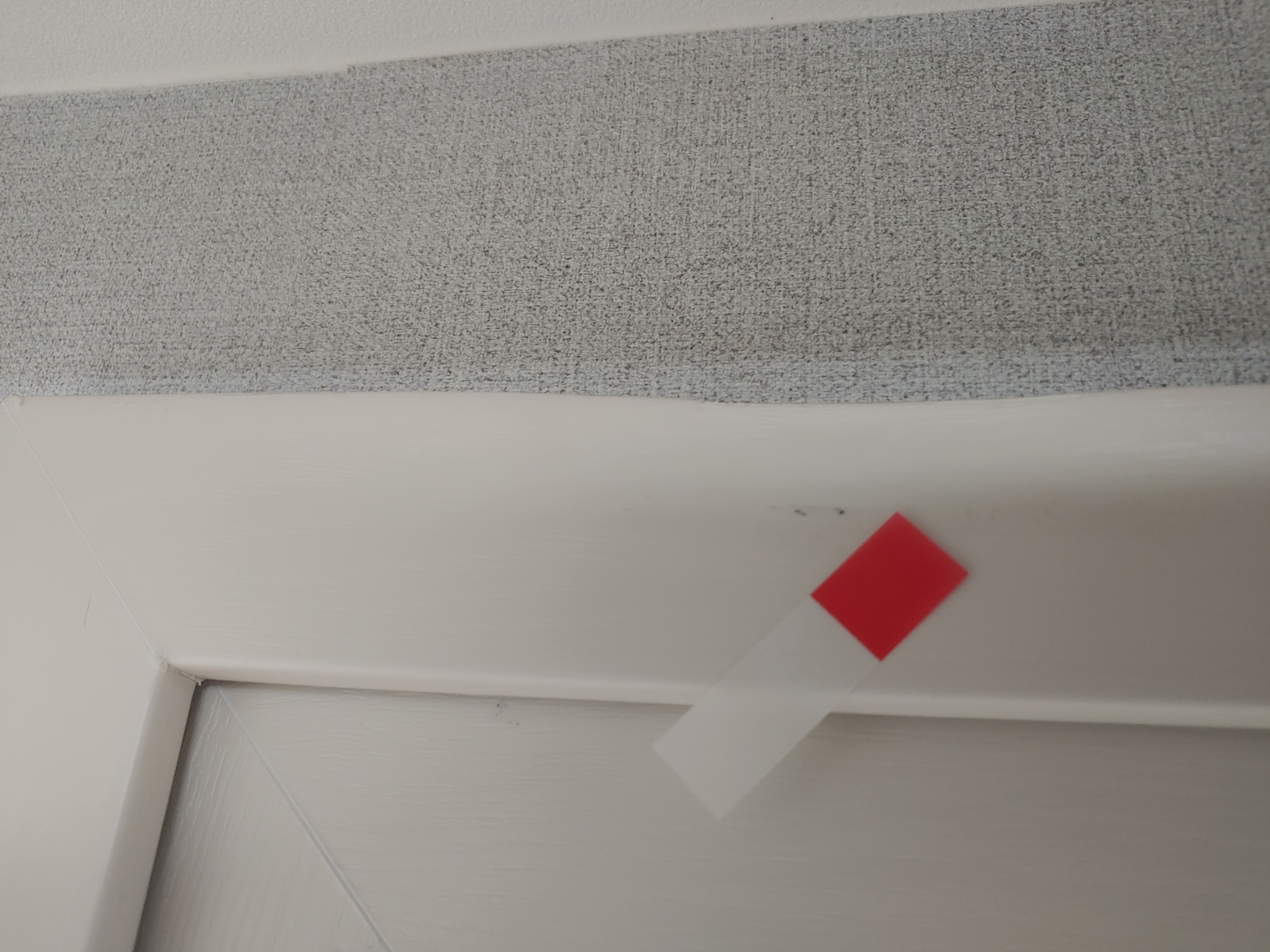 사진을 보시면 검게 마킹한부분이 작년 10월말쯤 사전 전검때 발견한 하자 입니다. 양쪽 상단 모서리 비슷한 곳에 두군데가 그랬구요. 안쪽으로 찌그러져있고 그부분을 만져 보았을때 거끌꺼끌한 느낌과 표면에는 검게 그을린듯한 자국이 있었습니다. 그리고 틀과 석고보드 사이를 보았을때 그 부분만 밀착이 안된 상태였구요.
