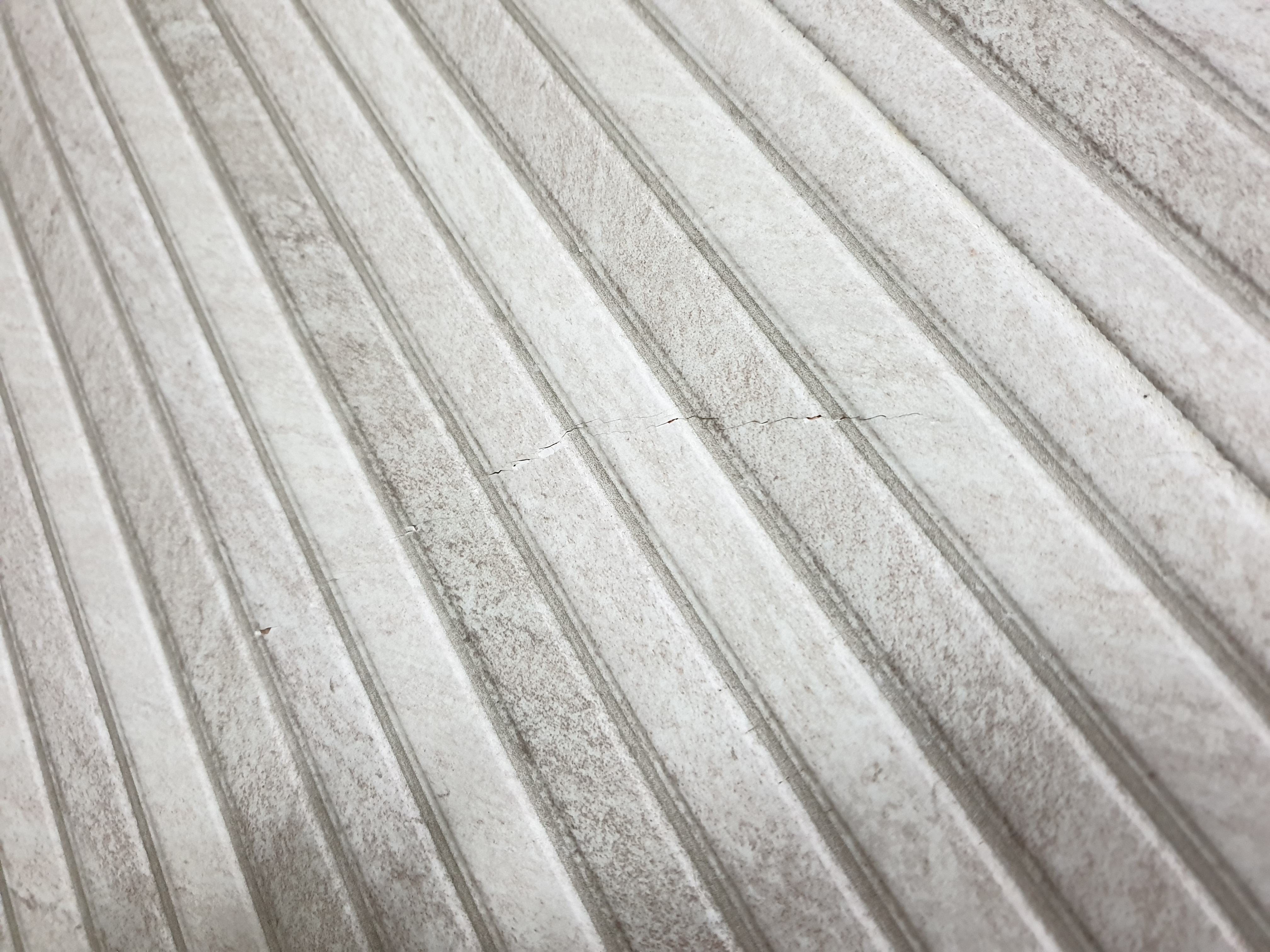 타일에 발생한 균열을 자세히 들여다 보면 표면 유약이 아직 덜 떨어지고 붙어 있다면 최근에 발생한 균열로 추정할 수는 있습니다. 시간이 지나면 욕실내 물청소 등에 의해 균열부위 파괴된 유약이 씻겨 내려갈 수 있음에 따라 발생 시기를 추정할 수는 있을 것이란 뜻이오니 참고하시기 바랍니다.