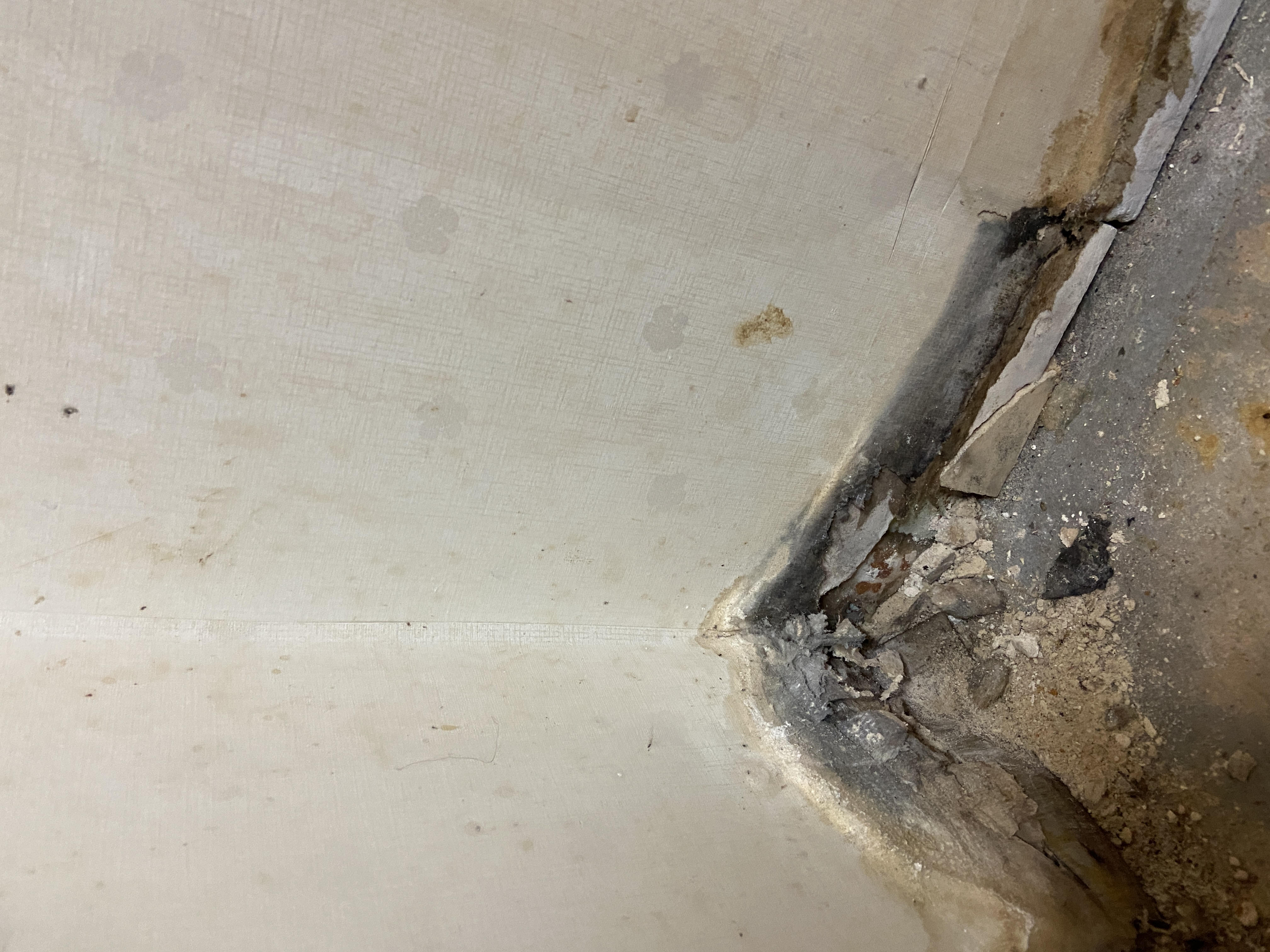: 벽 하단부 석고보드는 오랜 습기의 영향인지 부서지고 가루가 되어서 바닥에 계속 떨어짐