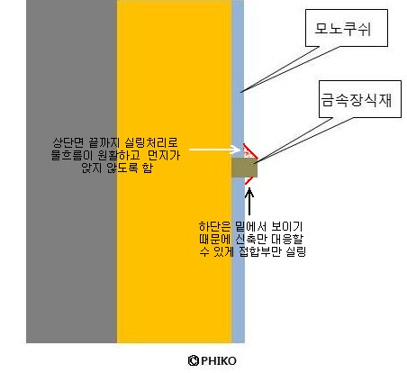 최소한의 실란트 마감만으로도 문제를 방지할 수 있었을 텐데.. 아마도 디자인상 실란트가 붙어 돌출철물이 뭉뚝하하게 보여지는 것이 싫었을 수도 있을 듯 합니다.