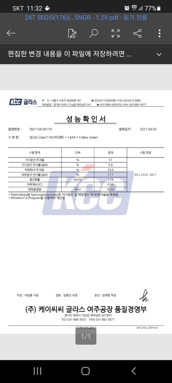 ▶ 아래 창호 시험성적서는 KCC 공장이고, 계약에 명시된 유리는 LX하우시스 유리입니다.