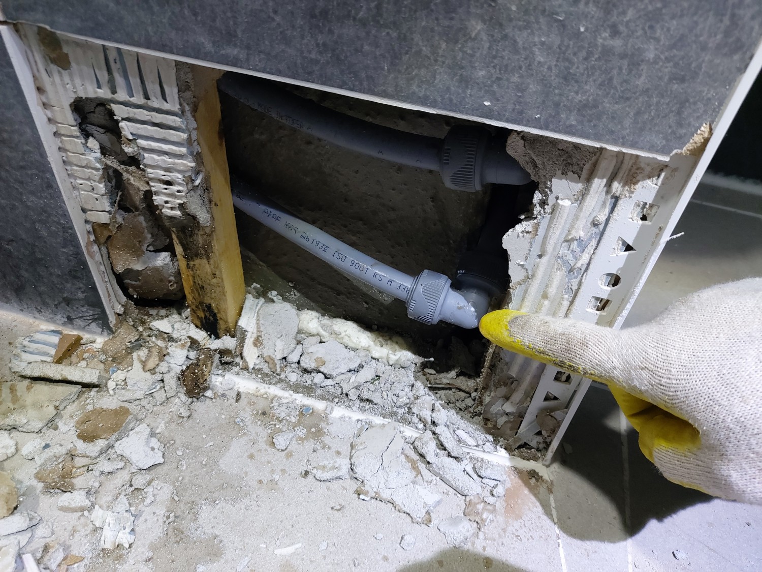화장실 타일 시공 불량, 수도관 노출 및 누수