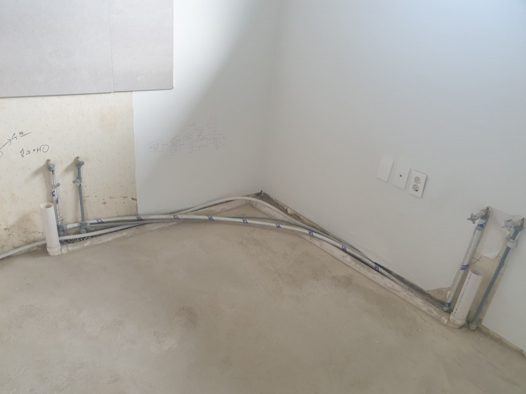 세탁기 하수 및 상수관 또한 업체가 깜박잊어 나중에 시공되어 미장된 바닥 위로 노출되어있습니다.