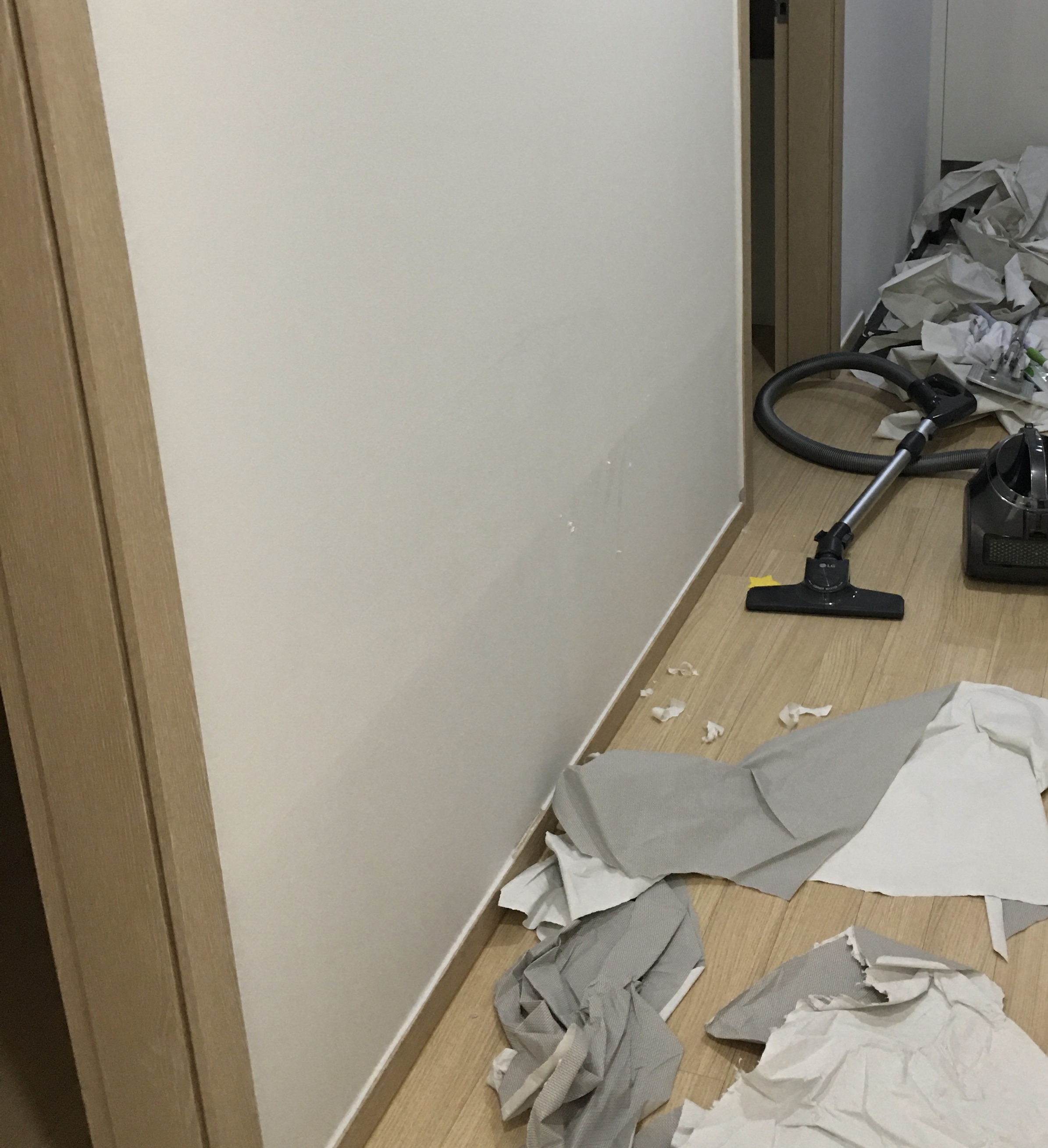 1. 석고보드 보수(하단부 잘라내고 새것 잘라붙임) 부분 경계선에 네바리를 치고 도배를 했으나 벽지가 뜹니다. 퍼티작업을 해야하지 않냐고 물었으나, 도배사는 오히려 티가 더 난다고 합니다.
