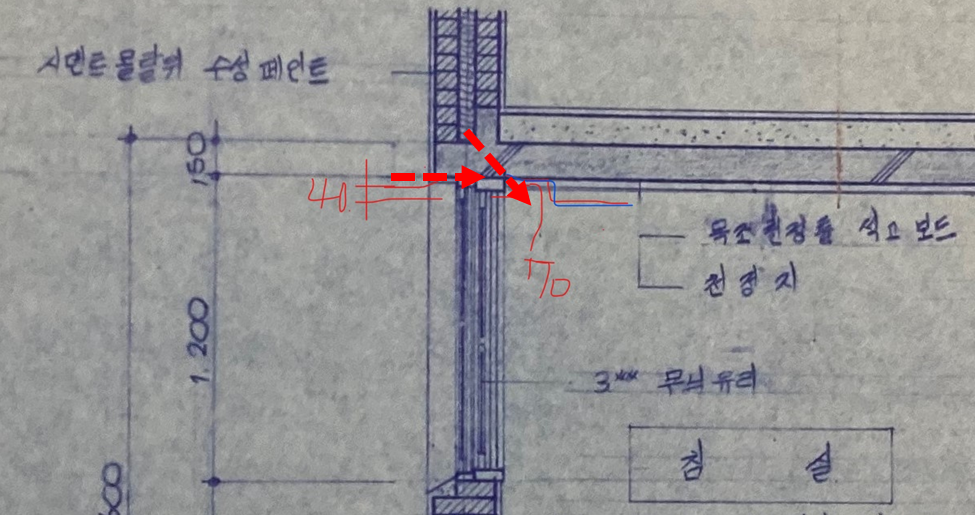 단면도는 바깥쪽에서 표시한 부분과 안쪽 천장부(도면과 달리 프레임 위로 10cm 정도 너비의 커튼홀이 있고 몰딩부착 석고보드가 이어져 있습니다)의 높낮이가 다른데 이 부분은 현재 어떻게 단면이 그려질까요? 이중창에 중간에 방범창이 있어서.. 관리실 의견인 바깥쪽 샤시 틈새에서 물이 흘러들어오기 어려운 것 같아 이 점이 궁금했습니다.