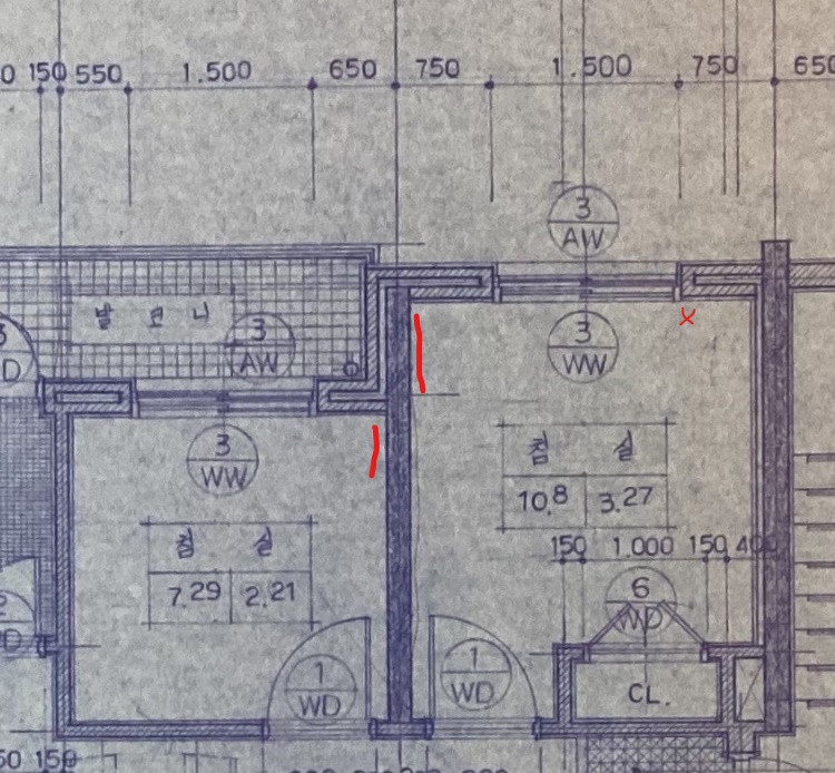 평면도상 x 표시가 물이 떨어진 부분 표시이고, 빨간 선은 현재 벽쪽에 곰팡이가 있어보이는 부분입니다.  앞서 문의드린 것처럼 두 벽이 베란다 우수관 근처이며 평소에는 물새는 것이 아닌 것 같습니다.