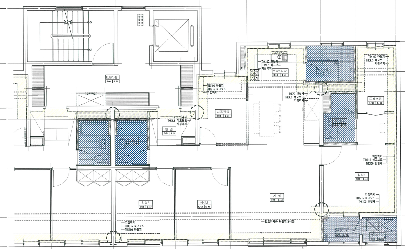 옆집과의 간벽에는 전체 벽에 단열재가 없는 것이 정상(?)입니다. 현행법에 맞습니다.