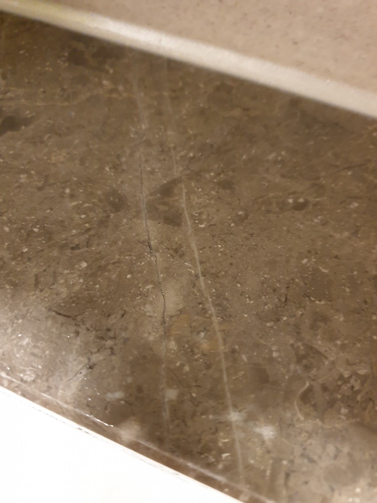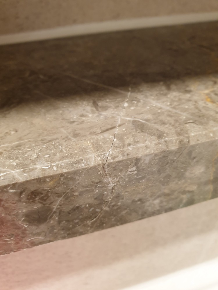 ▶ 첫번째 사진 정도의 균열은 보수 대상입니다. 전체를 다 새 것으로 갈지는 못할지도 모르지만, 최소한 균열 부위에 어린이 손 등이 다치지 않을 정도의 (투명에폭시 + 연마) 조치는 해주어야 합니다. 아마도 조금 강성인 주인댁은 "새 것으로 교체하지 않으면........" 이라고 했을 것 같습니다.