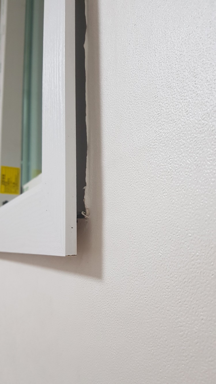 만약 벽이 수직의 상태가 아니라면, 엄밀히 이 창호 시공은 하자가 아닙니다. 하자는 오히려 그 벽체에 있는 거죠. 창호는 하자가 있는 벽체에서, 자기 기능을 지키려고 노력을 한 것이구요.