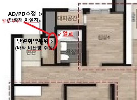 이런 점들을 고려했을 때 곰팡이가 발생한 부위는 PD벽과 연결된 벽을 통한 열교가 가능한 단열 취약부로 보여집니다.