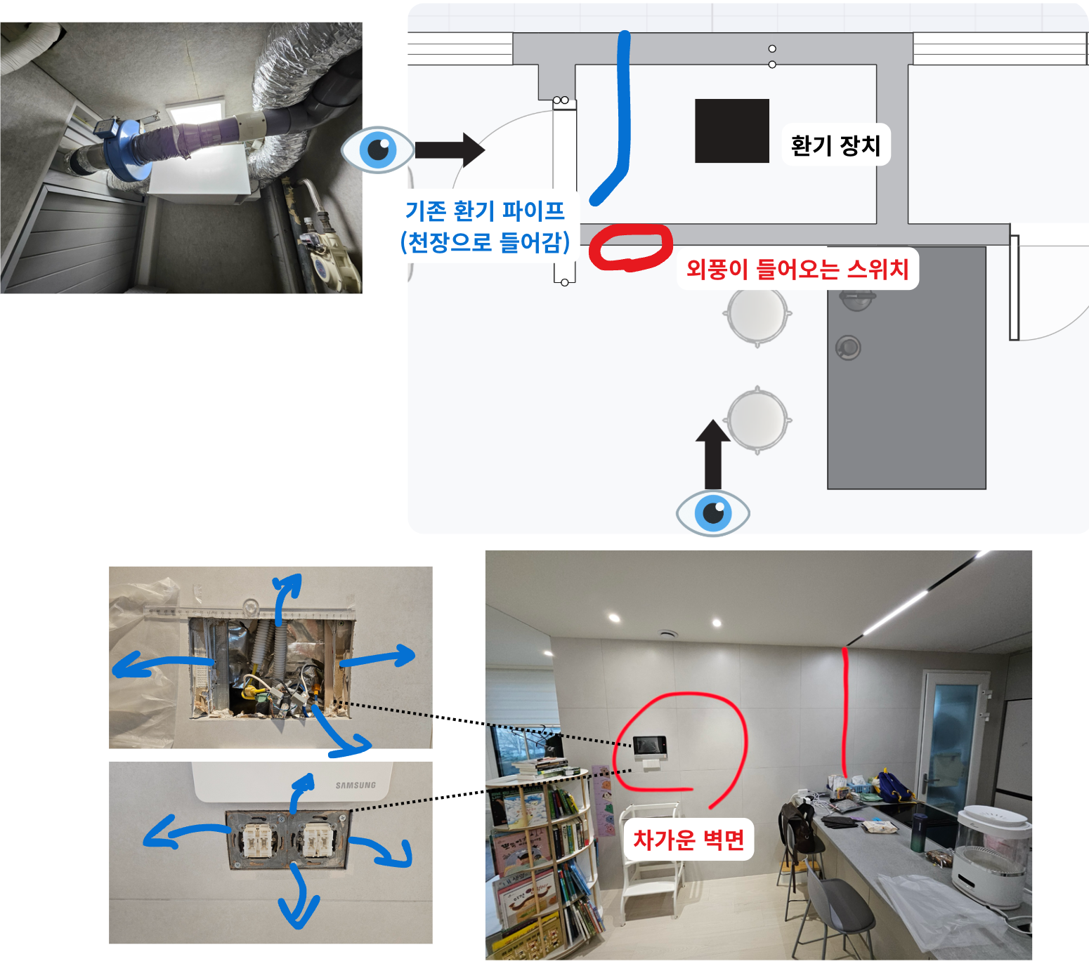 전열교환기와는 별개로.. 저 실외기실과 맞닿은 벽 스위치 틈에서 외풍이 많이 들어오는데 혹시 그게 관련이 있을 수 있을까요