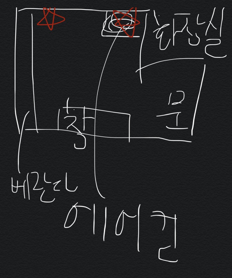 진동은 2호 실외기가 도는 경우는  첨부한 그림의 빨간 별표가 표시되어있는데서 주로 들리(느껴지)구요. 3호 실외기가 돌땐 화장실을 제외한 방 전체에서 느껴집니다.